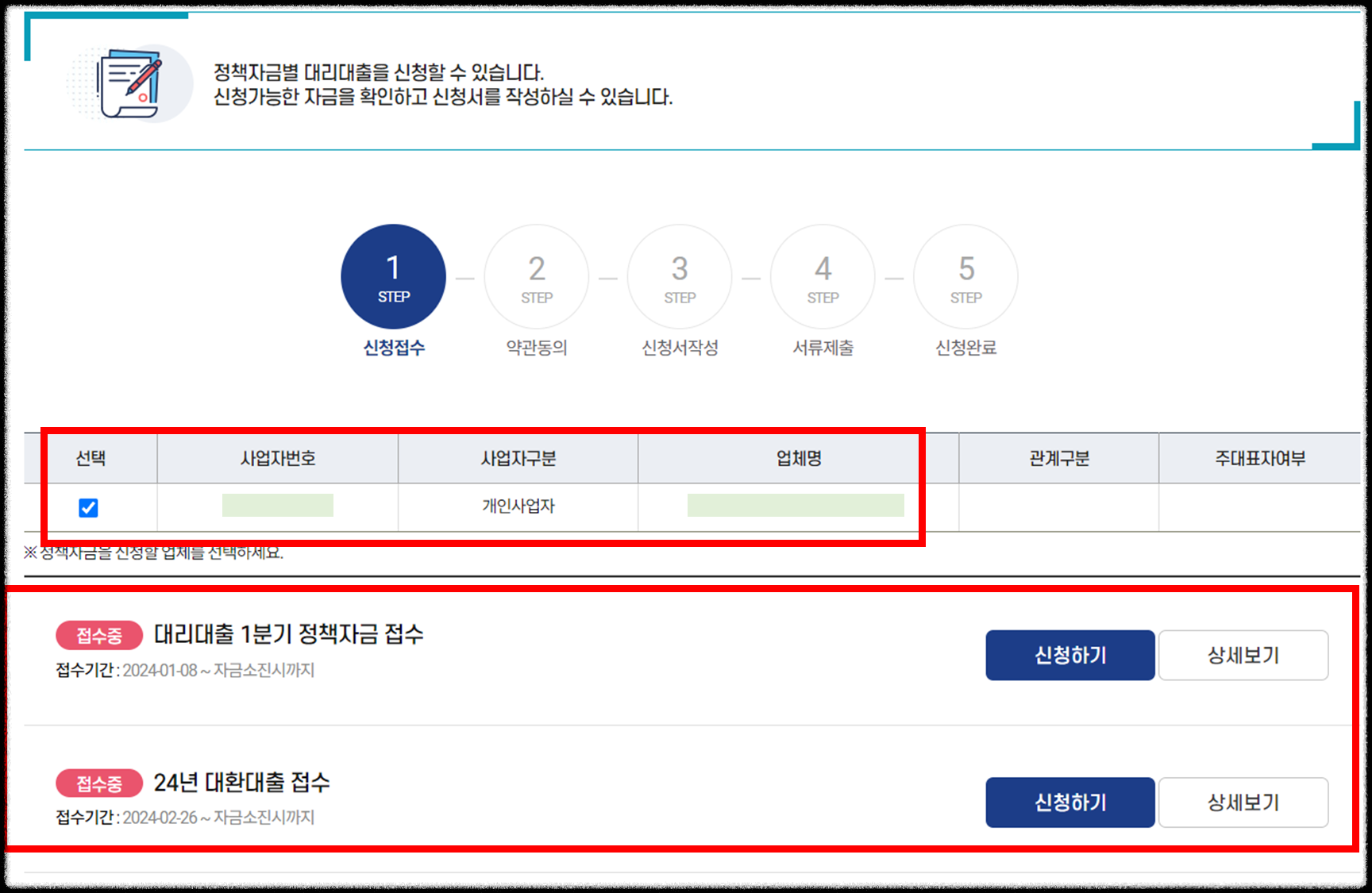 신청자의 사업자번호 등 정보가 나오고 현재 접수중인 대출항목이 나옵니다.
